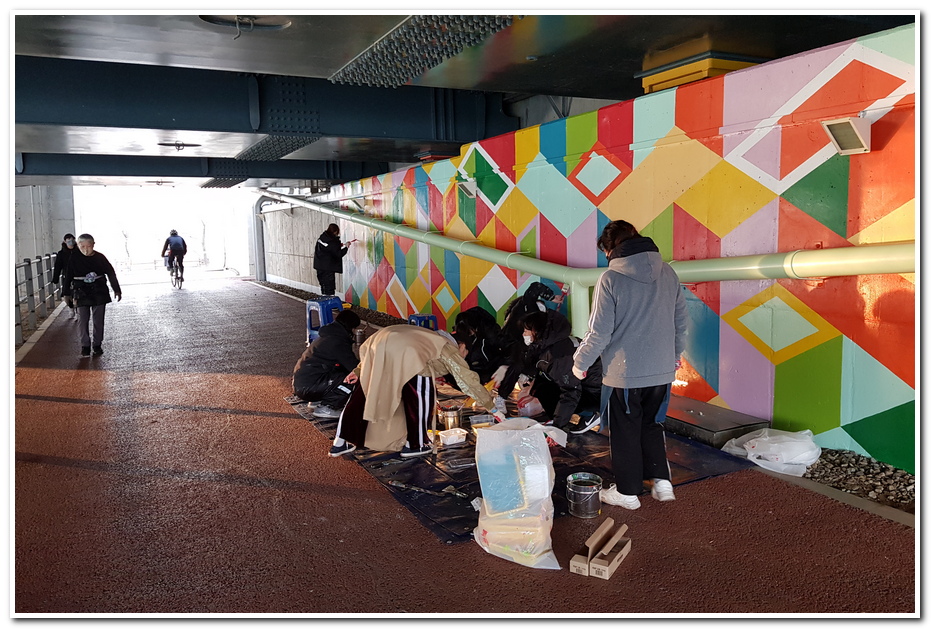 공원과 공원을 연결하는 다리 아래 옹벽의 칙칙함을 밝게 변화 시키는 작업