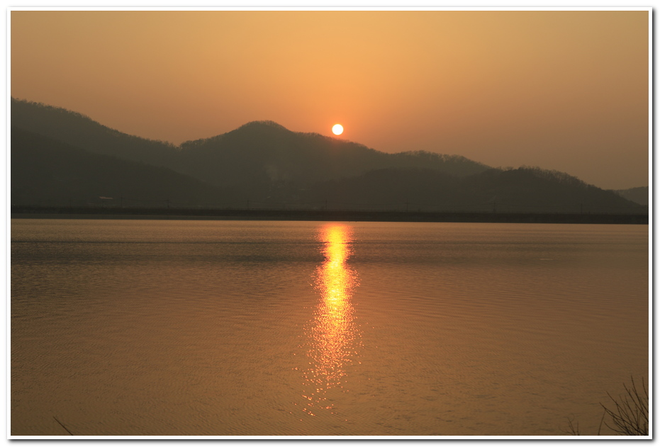 하루 일을 끝내면서 보니 쉼터 앞 호수의 물 빛이 붉게 물들어 있다.
