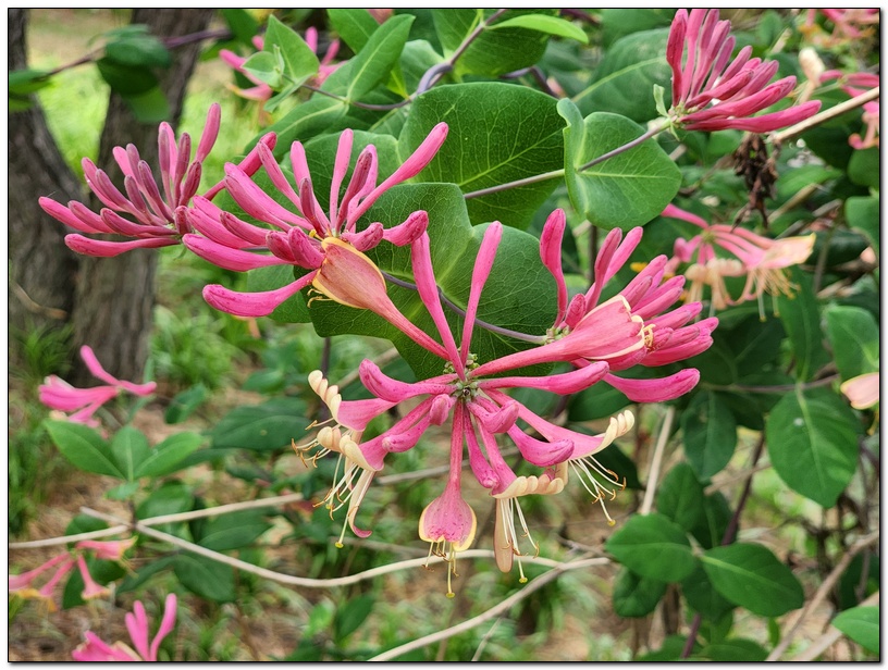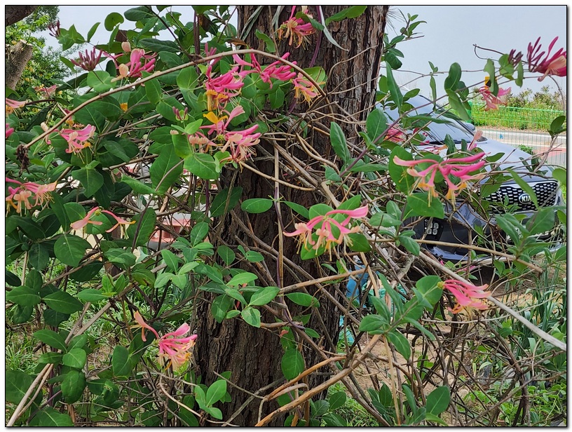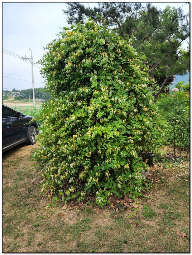 철봉으로 기둥을 세우고 덩굴을 올려서 인동 꽃탑을 만들었다.