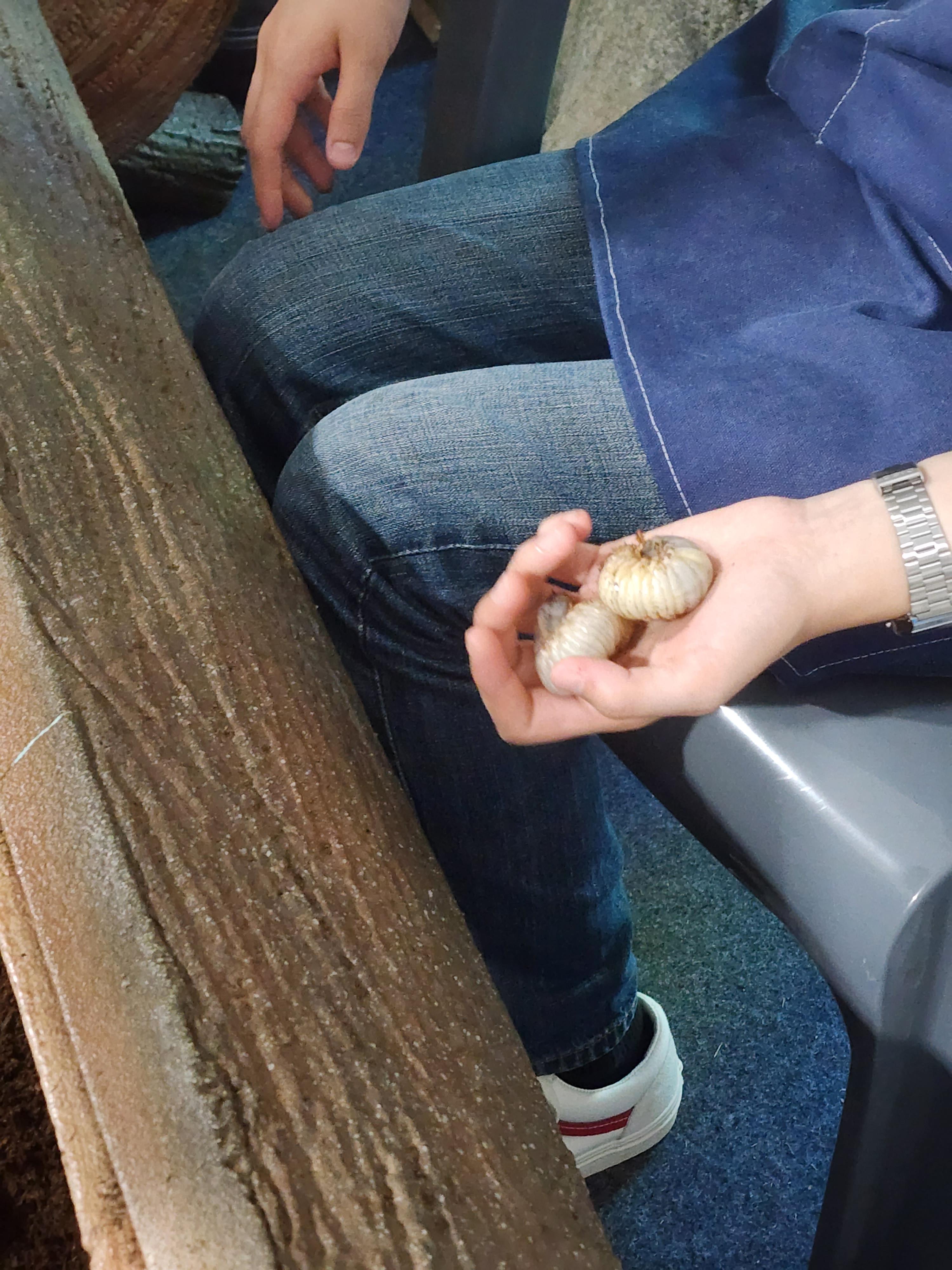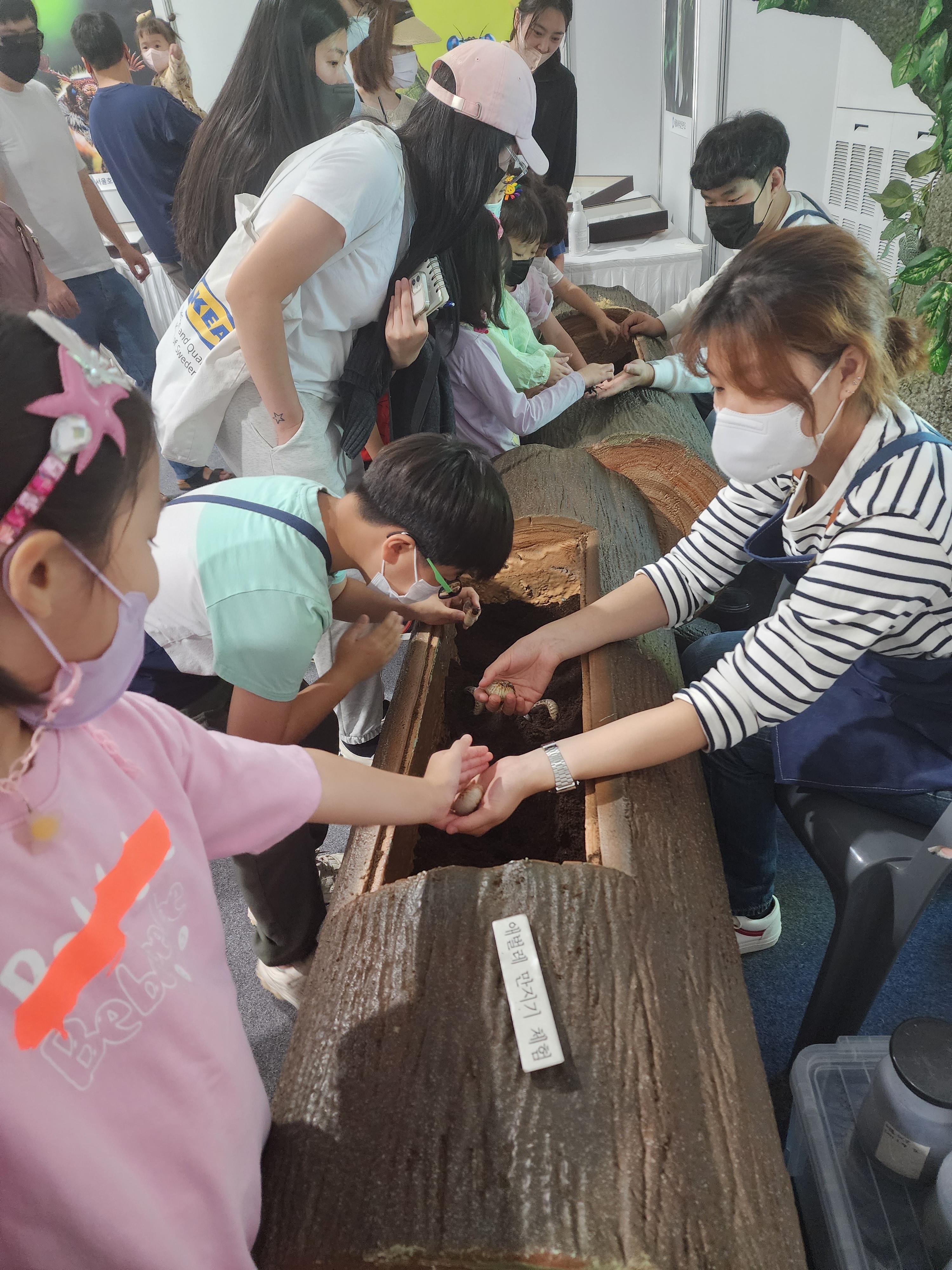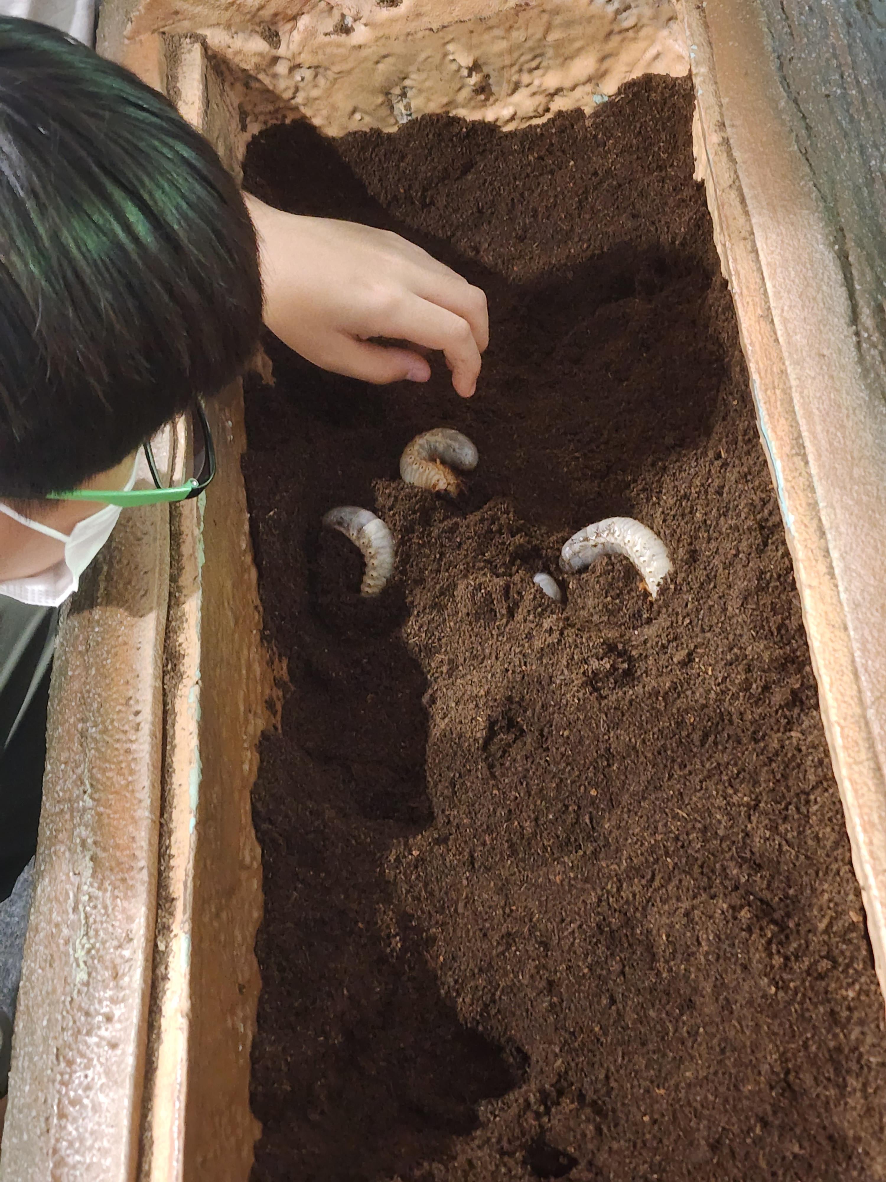 장수풍뎅이 애벌레가 신기한 듯 아이들의 관심이 크다.